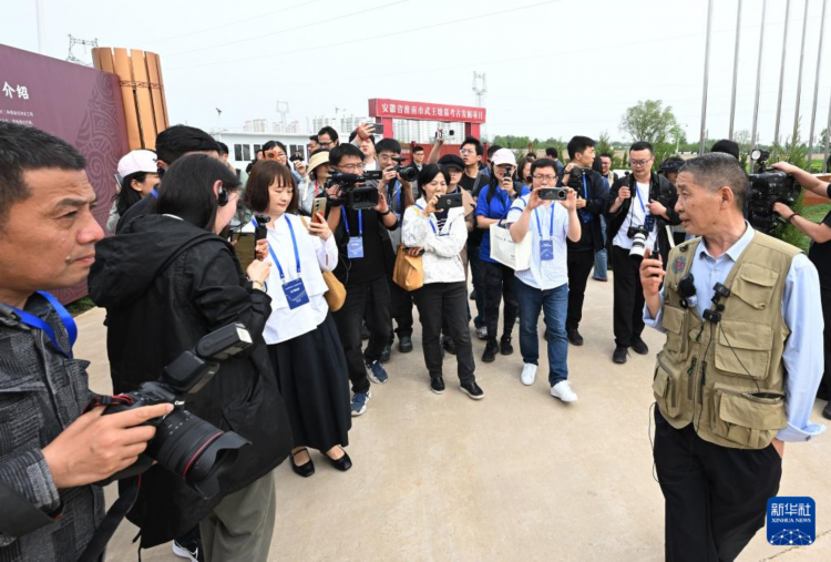 4月16日,安徽省文物考古研究所研究员、武王墩考古项目负责人宫希成(右一)向来访记者介绍情况。新华社记者 李贺 摄