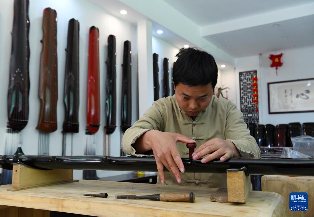 5月13日,河南省兰考县堌阳镇的斫琴师徐冰通过网络直播售卖古琴。