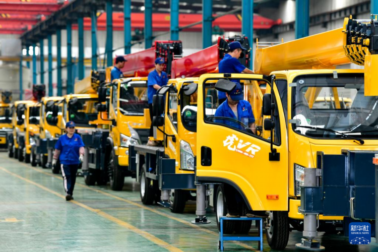 8月4日,在济宁四通工程机械有限公司总装车间,工作人员在吊车生产线上工作。
