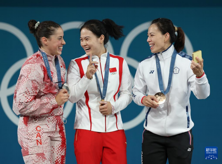 8月8日,冠军中国选手罗诗芳(中)、亚军加拿大选手沙朗(左)与季军中国台北选手郭婞淳在颁奖仪式上。新华社记者 杨磊 摄