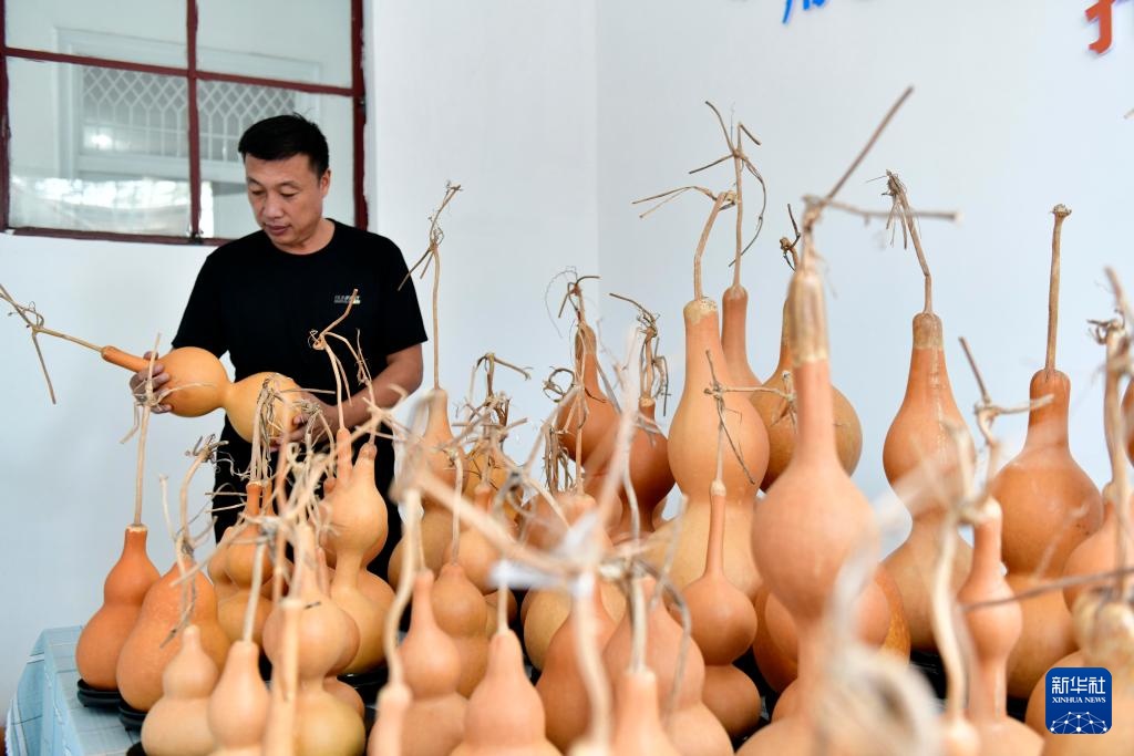 8月10日,在山东省济宁市微山县驩城镇西田陈村福禄葫芦合作社,村民在挑选文创葫芦。