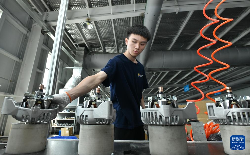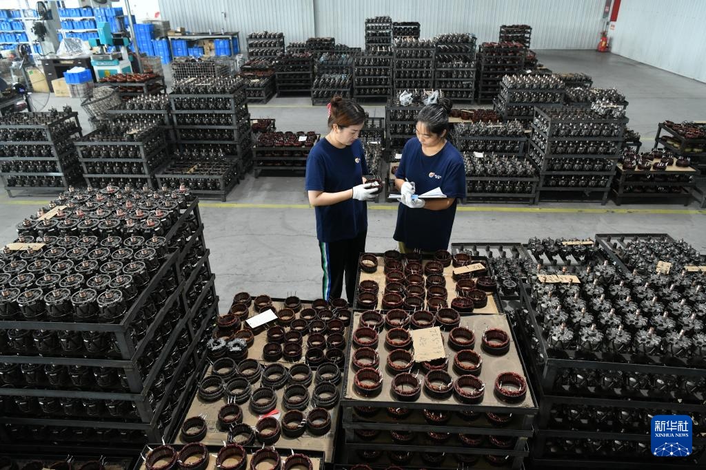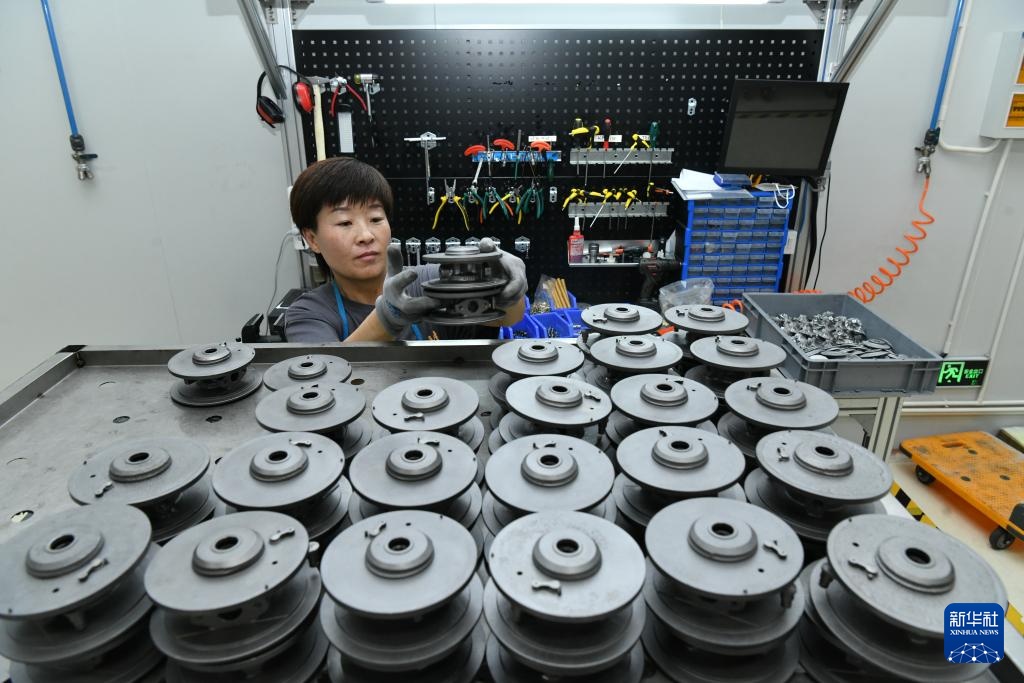 8月10日,在位于河间市的河北江轮机电有限公司,工人在汽车零部件生产线上工作。