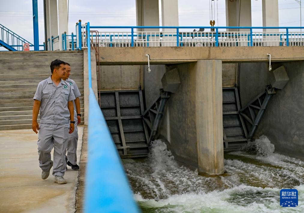 8月12日,工作人员在大西海子水库开闸放水后在闸后巡检。