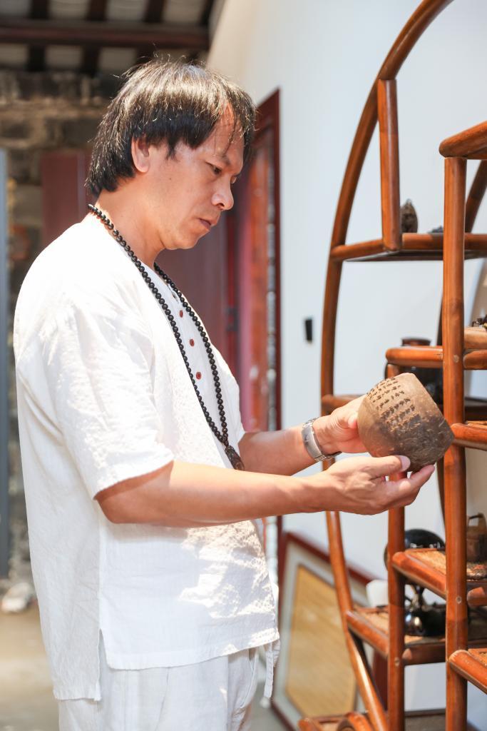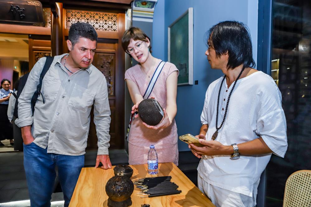 8月9日,吴名驹在给朋友介绍他的椰雕作品。