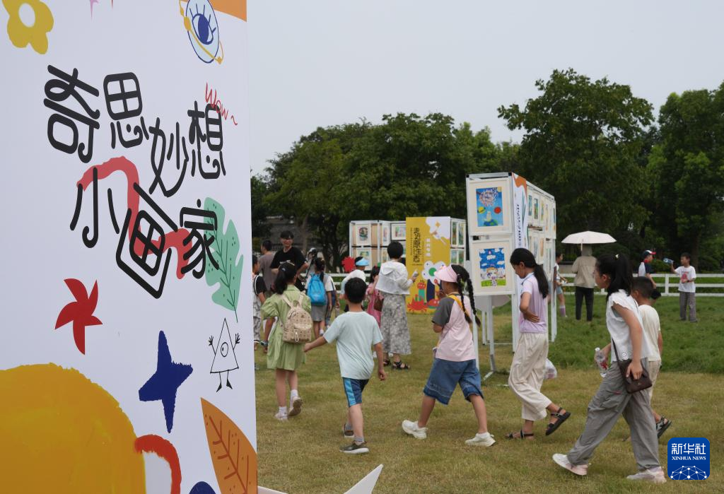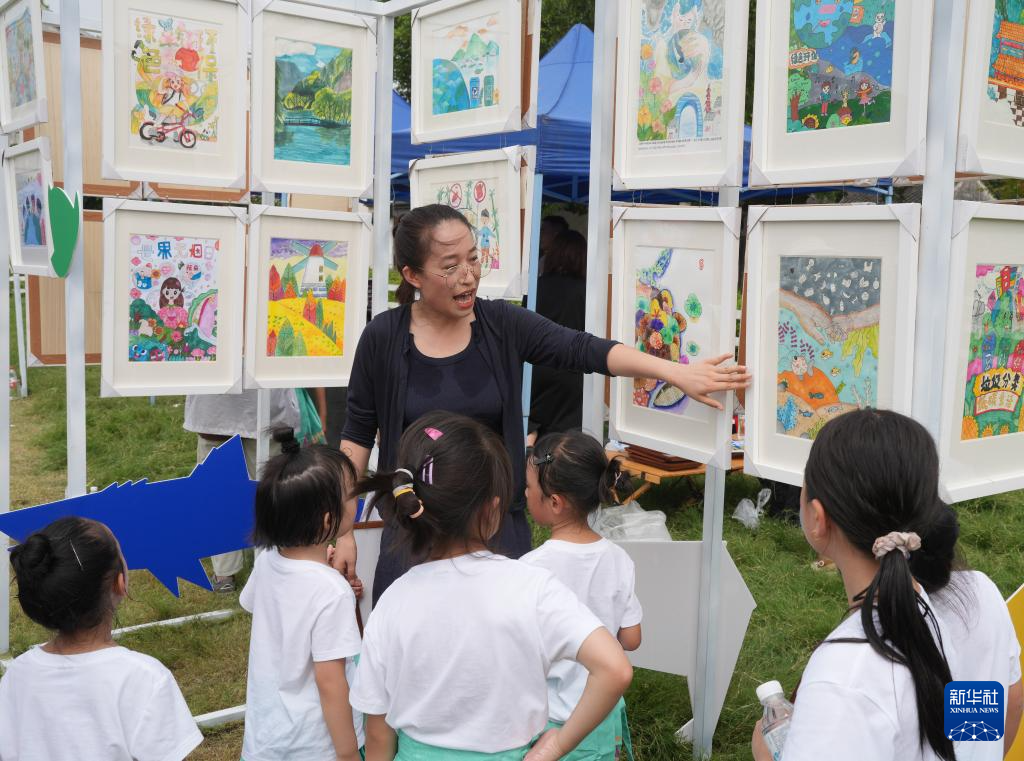 8月13日,在湖州吴兴太湖新溇港活动现场,儿童们在参观画展。