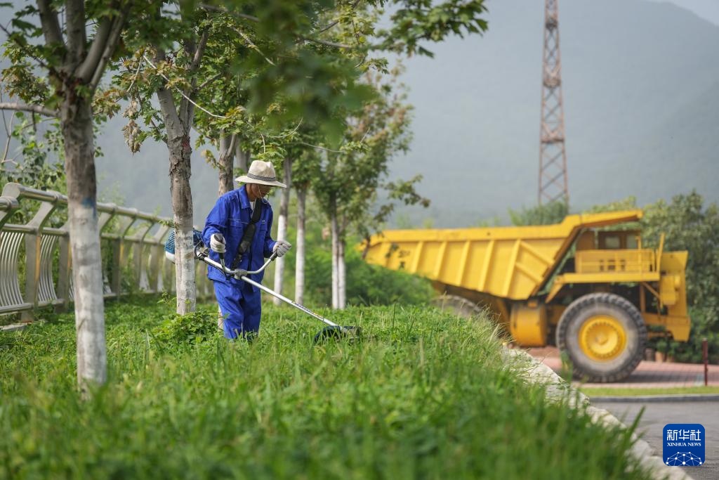 8月15日,绿化工人在本溪钢铁(集团)矿业有限责任公司南芬露天铁矿进行草坪修整工作。