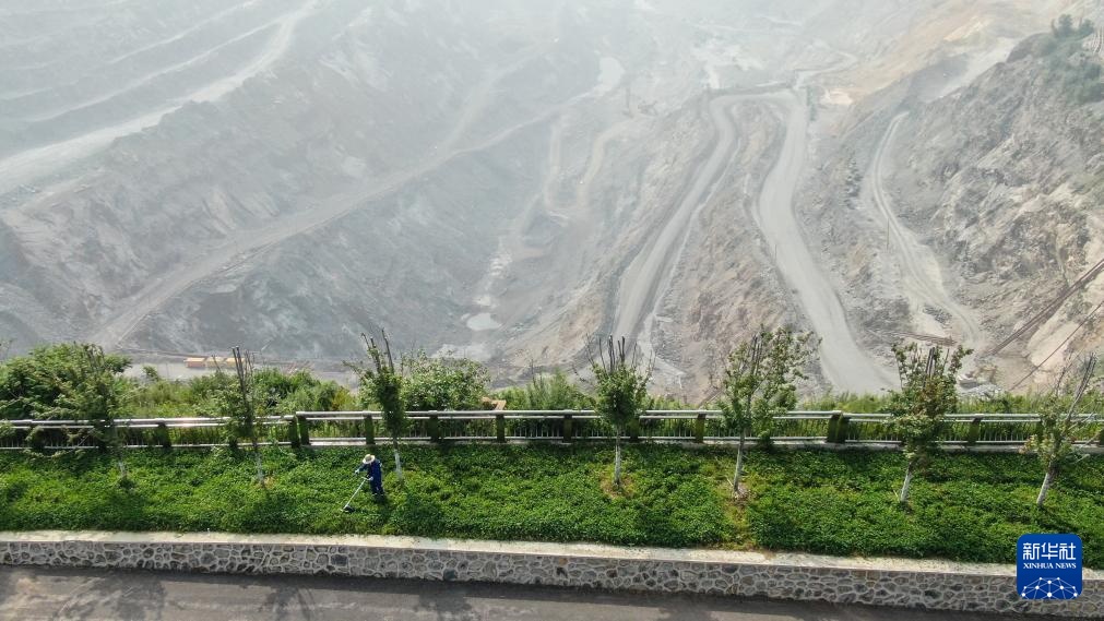 8月15日,绿化工人在本溪钢铁(集团)矿业有限责任公司南芬露天铁矿进行草坪修整工作,不远处是正在作业的采矿区(无人机照片)。