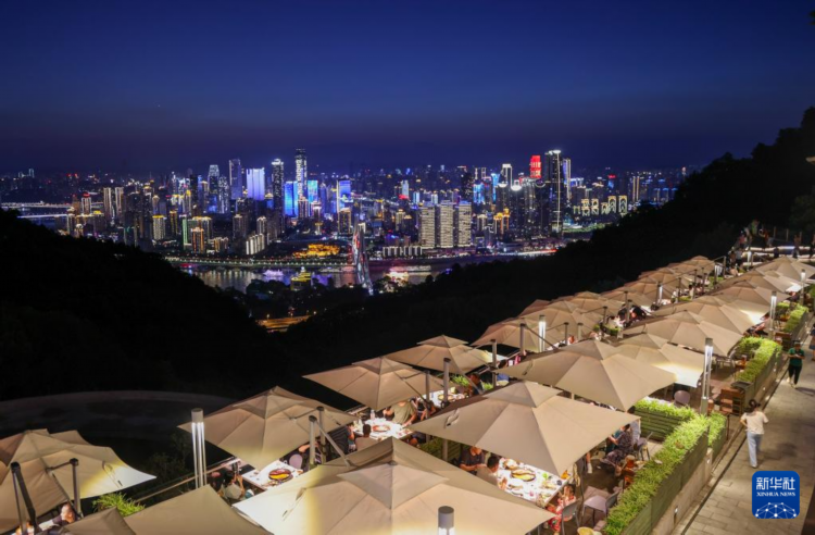 8月23日,重庆南岸区南山风景区内一家网红火锅店内,游客们一边品尝火锅,一边欣赏重庆迷人的夜景。