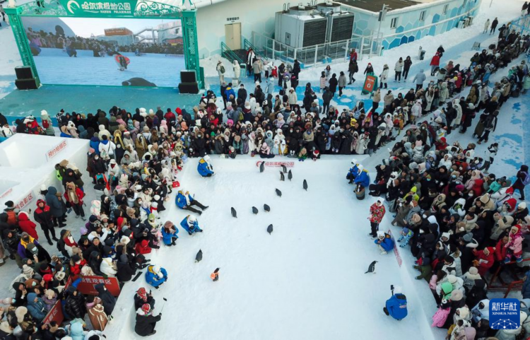 游客在哈尔滨极地公园广场观看企鹅巡游(1月5日摄,无人机照片)。