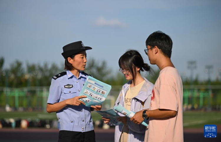 9月5日,在天津大学北洋园校区,公安民警为大学生宣传反诈防骗知识。