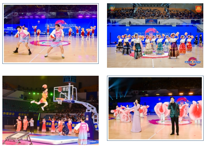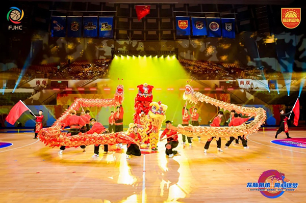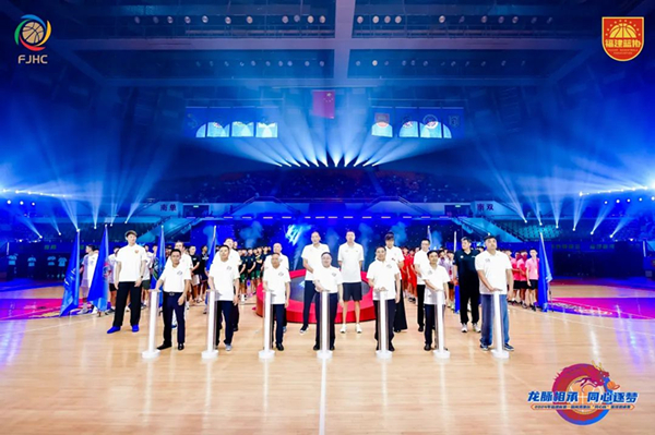 当天的开幕式包括中国篮球明星红毯秀、文艺演出、赛事揭幕战等多个环节。在红毯秀中,十多位篮球名宿齐聚一堂,共襄盛举。随后开启的超级盛典以《龙狮呈祥》为开场,瞬间点燃现场热烈的气氛。蹦床扣篮表演《青春跃起来》、歌曲《相亲相爱一家人》等节目依次上演,将现场气氛推向高潮。