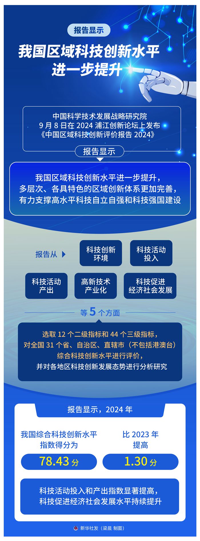 新华社上海9月8日电(记者董雪、温竞华)中国科学技术发展战略研究院8日在2024浦江创新论坛上发布《中国区域科技创新评价报告2024》。报告显示,我国区域科技创新水平进一步提升,多层次、各具特色的区域创新体系更加完善,有力支撑高水平科技自立自强和科技强国建设。