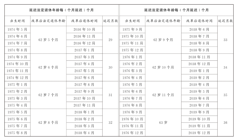 第一条 从2025年1月1日起,男职工和原法定退休年龄为五十五周岁的女职工,法定退休年龄每四个月延迟一个月,分别逐步延迟至六十三周岁和五十八周岁;原法定退休年龄为五十周岁的女职工,法定退休年龄每二个月延迟一个月,逐步延迟至五十五周岁。国家另有规定的,从其规定。