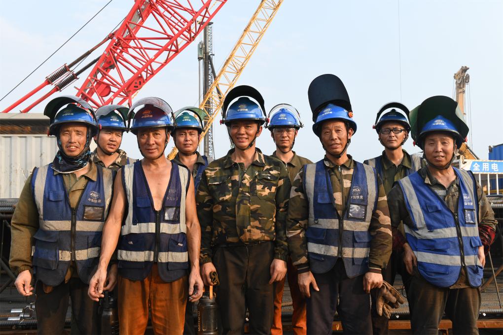 在完成了当天的生产任务后,胡建国(前排左一)和部分工友在工地上合影留念(9月12日摄)。