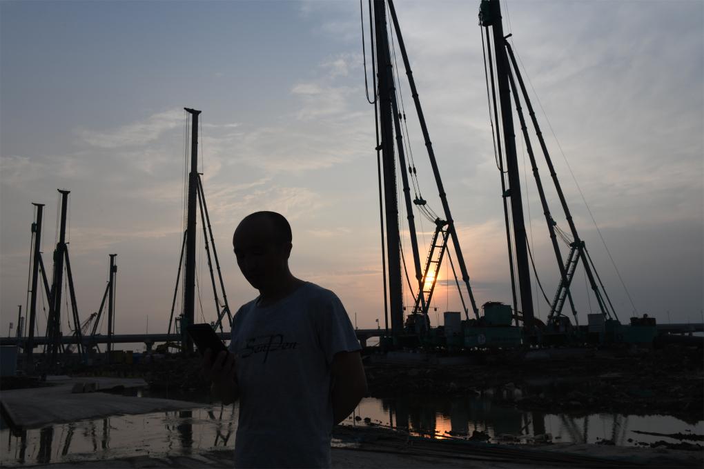 胡建国在工作间隙拍摄远处的南沙全民文化体育中心综合体(8月27日摄)。