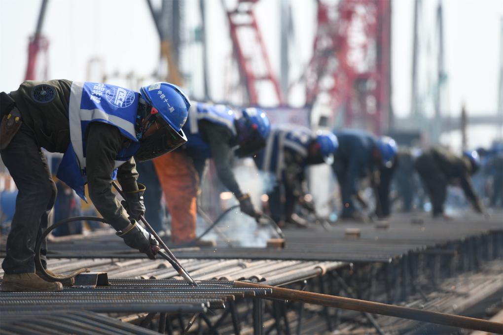 胡建国(左一)带着他的仡佬族工友们,焊接钢筋笼(8月27日摄)。