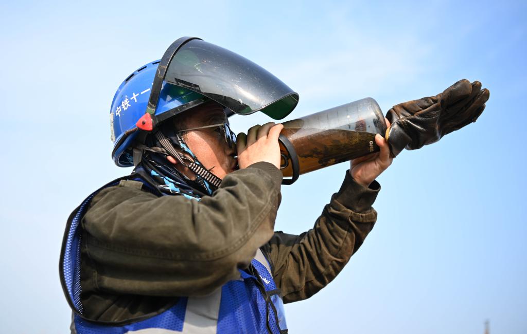 胡建国在工作的间隙,掀起面罩透气(9月12日摄)。