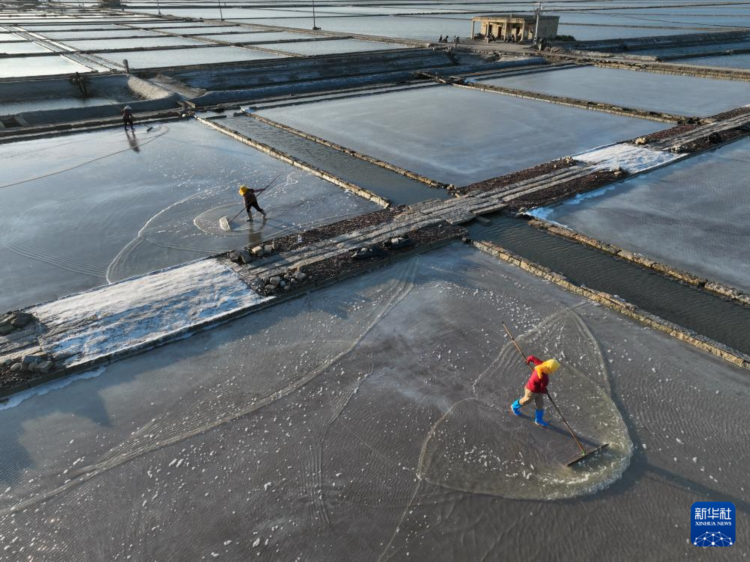 11月8日,盐工在盐田里进行旋盐作业(无人机照片)。