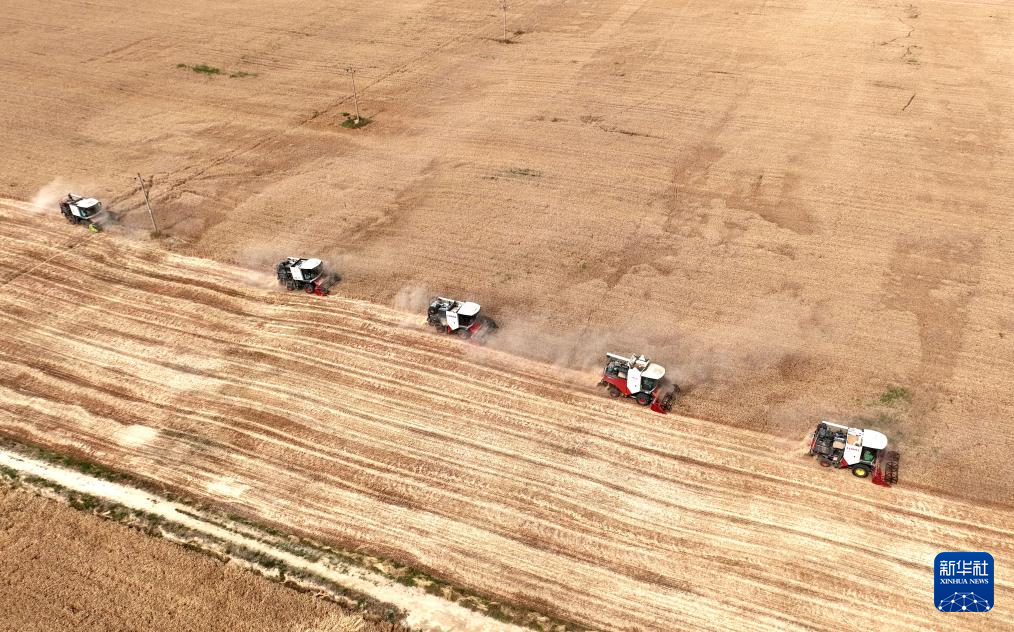 时下,河北省邢台市隆尧县61万亩小麦正值收获季,当地农民抢抓晴好天气开展机收作业。