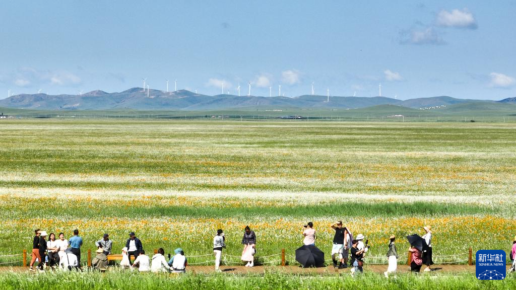 盛夏时节,内蒙古锡林郭勒盟正蓝旗金莲川草原迎来最佳观赏期,金黄色的花海与苍茫草原相映成趣,世界文化遗产元上都遗址的断壁残垣在草原上清晰可见。游人流连花丛中或驻足遗址前,感受自然野趣与历史文化。