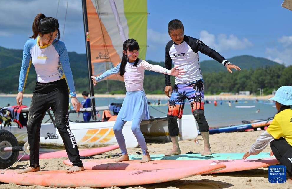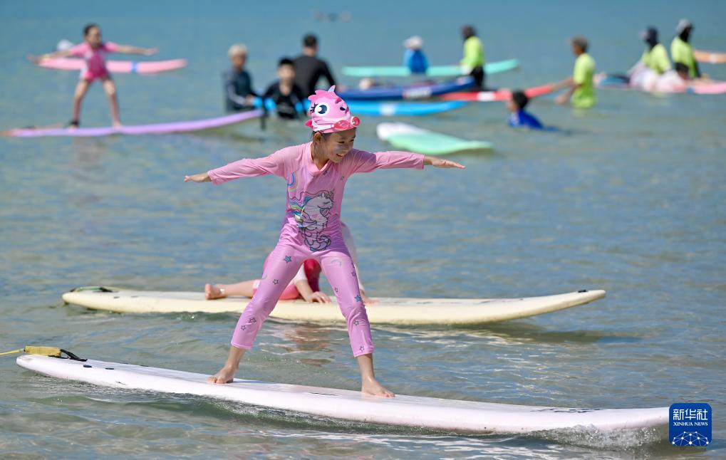 暑期,许多游客来到海南三亚,学习体验冲浪,感受与海共舞的乐趣。