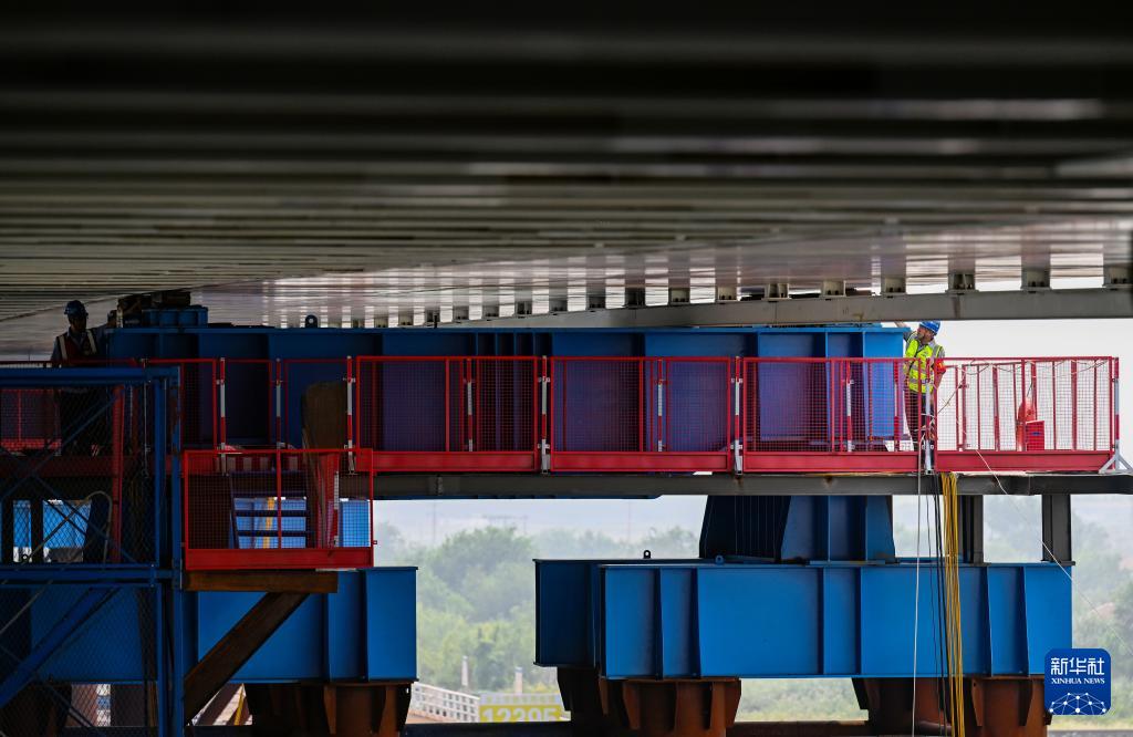 9月16日,施工人员在天津市滨海新区西中环快速路跨海河桥工程建设现场作业。