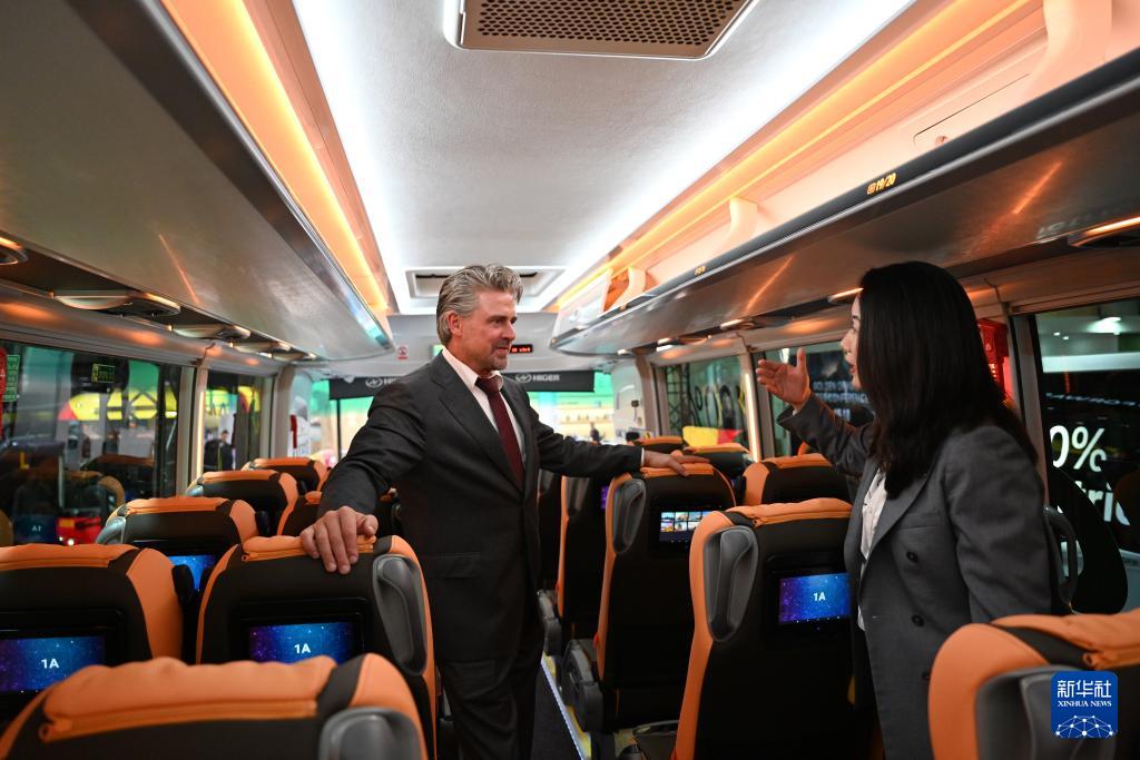 10月4日,在比利时布鲁塞尔举行的世界客车博览会上,工作人员在展出的海格品牌欧洲首发的纯电新V系客车内部向客户做介绍。