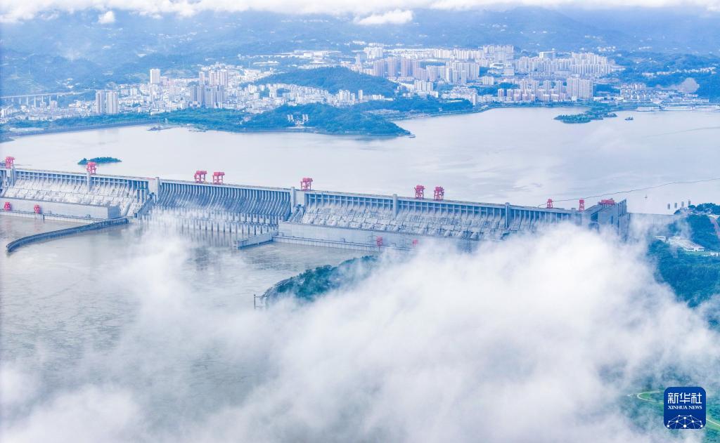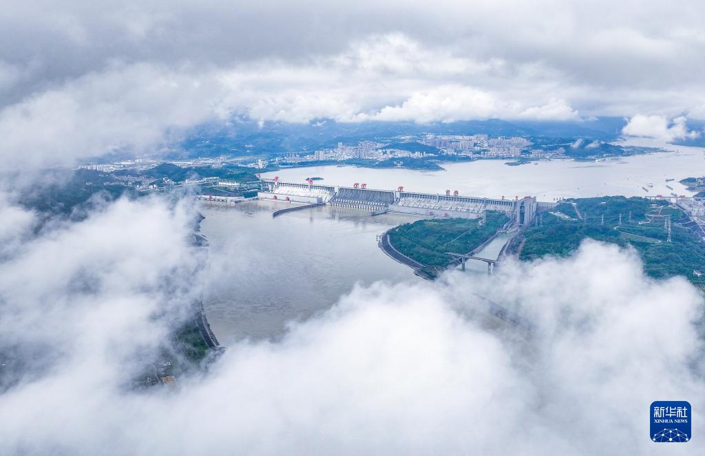 连绵阴雨初歇,位于湖北宜昌的三峡大坝云雾缭绕,气象万千。