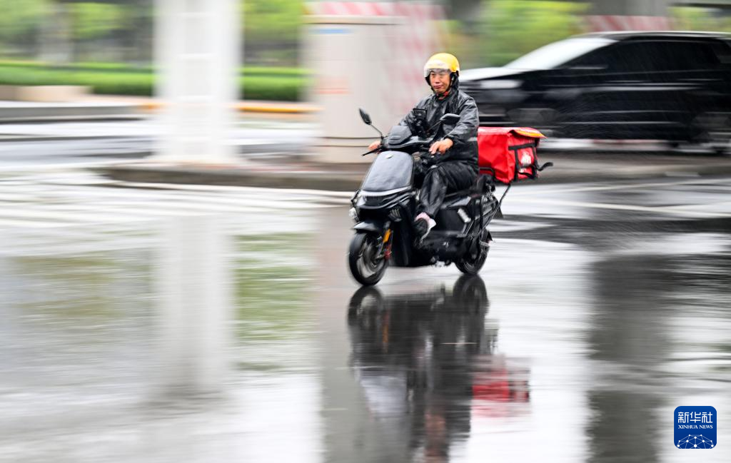 10月9日,在天津市南开区,一名外卖骑手在雨中行驶。