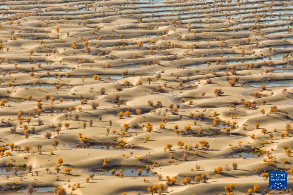 时下,新疆和田地区的胡杨迎来最佳观赏期,成片换妆的胡杨林与水天相映,共绘金秋美景。
