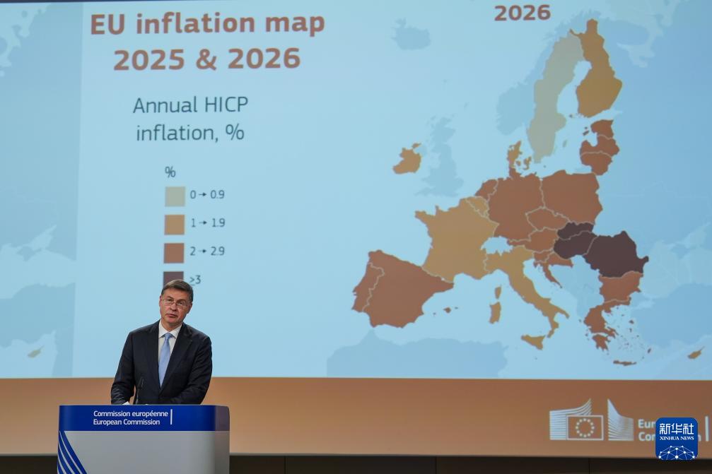 11月17日,欧盟委员会负责经济事务的委员东布罗夫斯基斯在比利时布鲁塞尔发布2025年秋季经济展望报告。新华社记者 彭子洋 摄