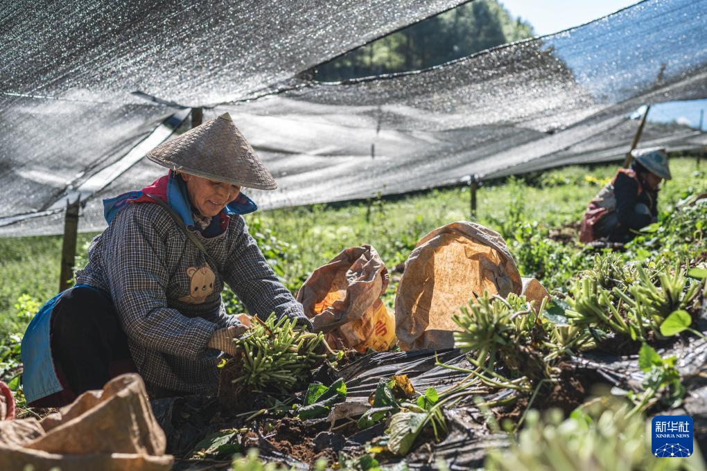 11月17日,农民在云南省保山市隆阳区杨柳白族彝族乡冷水村一处山葵种植基地采摘山葵。