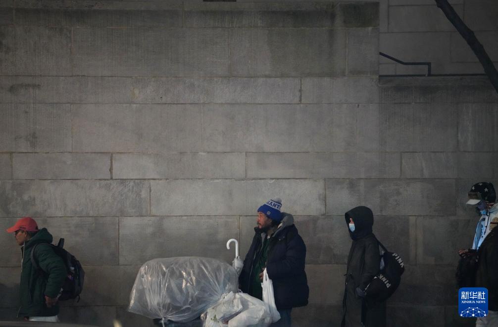 当日,数百名无家可归者和其他需要救助的人在美国纽约曼哈顿的一个救助点排起长队,在暮色中等待领取一份免费晚餐。