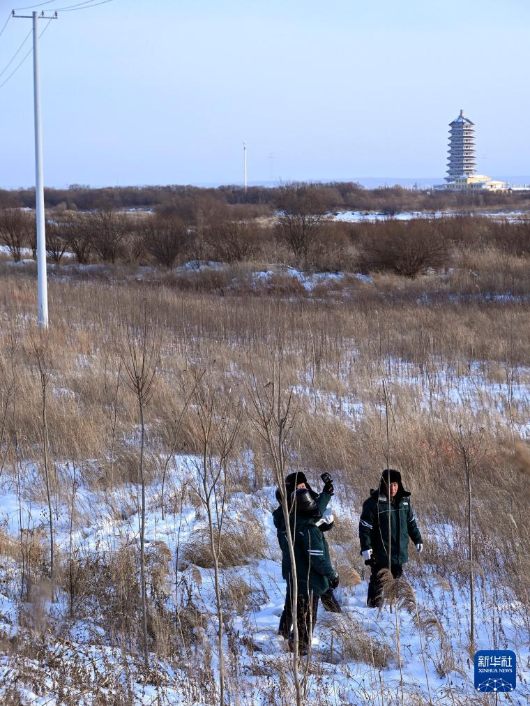 12月30日,国网黑龙江抚远市供电公司工作人员冒着严寒,在位于抚远市的黑瞎子岛上巡线。
