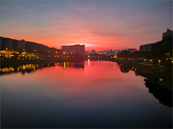 残存的夕阳用剩余的光亮照明了河流两岸,映射出两岸的景光,在河流中呈现一幅安祥自然的画面。