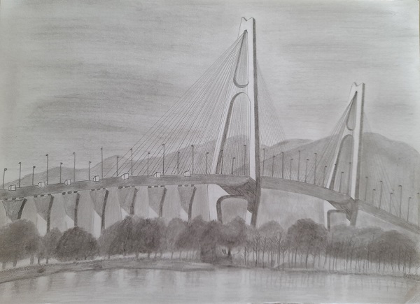 作品名称:《福州市琅岐闽江大桥》 作品类别:绘画 姓名:蔡佳慧 年龄:15岁 国别(地区):马来西亚 选送单位:砂拉越古晋中学(国民型) 指导老师:张雅芳 创作缘由: 福州市琅岐闽江大桥- 位于中国福建省福州市马尾区的一座公路斜拉桥,跨越闽江,连接琅岐岛与福州主城。琅岐闽江大桥分别由主桥、桥塔、斜拉索、桥墩、引桥及各立交匝道组成;主桥呈西北至东南方向布置。琅岐闽江大桥采用钻石形斜拉桥塔方案,并桥塔横梁、塔顶采用圆弧顺接过渡,增强了景观效果,并与当地的“福”文化相融合,彰显福州市之彩。我对这的印象深刻,若有一天能够到此一游,心即可满足。 |