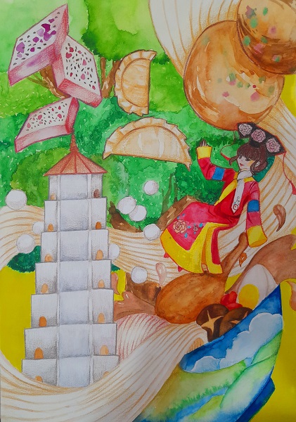 作品名称:《我印象中的福州》 作品类别:绘画 姓名:杜维恩 年龄:15岁 国别(地区):马来西亚 选送单位:砂拉越古晋中学(国民型) 指导老师:张雅芳 创作缘由: 民,以食为天,而饮食是文化的核心灵魂,通过舌尖品尝美食,可以认识与传承蕴含在其中精髓。为了完成画作,我从网上采集了一些福州美食。例如例如炒肉糕、鱼丸、肉燕、海蛎饼和福州线面。在查找资料时,无意中看到了福州白塔和千年榕树王。榕树王的树干需要6人才能合抱得完,真令人震惊。在这幅画作中也加入满族女子的服装,因为它是最吸引我的。正因为这几种美食,地标和满族服饰吸引了我的目光,我将对它们的印象作画刻记心中。若未来有幸到访福州,希望能尝试这些美食,参观白塔和榕树王以及试穿满族服装。其中最让我垂涎的便是福州线面。面食本就是我最爱的食物之一,加上各种我喜爱的配料,让我隔着银幕仿佛都能闻到其香味。 |