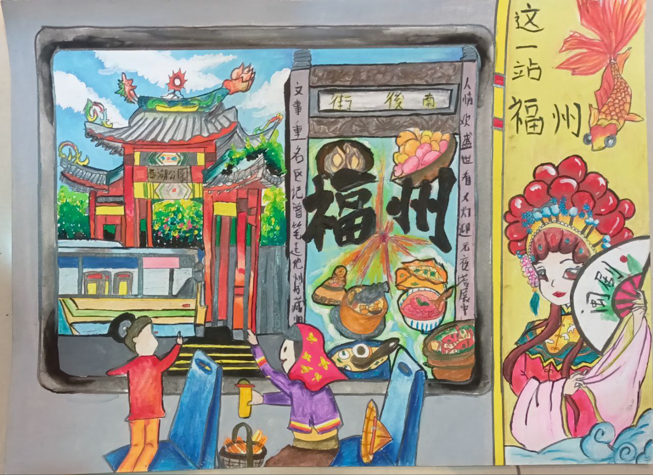 作品名称:《一次福州之旅》 作品类别:绘画 姓名:刘奕霙 年龄:16岁 国别(地区):马来西亚 选送单位:砂拉越马拉端东华国民型中学 指导老师:林芝朸 创作缘由: 两位游客坐在大巴上,车上播着“这一站,福州”他们首先看到了闽剧。闽剧是现存唯一用福州方言演唱,念白的戏曲剧种。透过窗外望到了福州城中心城区的南后街,位于福州市鼓楼区湖滨路71号的福州西湖公园。西湖公园是福州保留最完整的一座古典园林。一路上,游客看到了使用几十种原料如海参、鲍鱼等制成的美食——佛跳墙。看到了福州闽菜中传统甜食之一,以芋头煮熟加入许多配料如红枣,樱桃,瓜子仁等制成的甜食——芋泥。海蛎饼俗称蛎饼,这是一种油炸小吃,口感酥脆可口。红鲟糯米饭,最下面是荷叶,中间是糯米,最上面放上红鲟。富有弹性,口感好的鱼丸也吸引游客的目光。 |