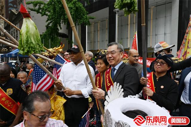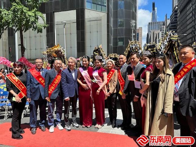 东南网5月20日讯(特约记者 纽约墨人 王早早)当地时间5月19日,第三届“亚裔传统文化大游行”活动(以下简称“大游行”)在纽约曼哈顿举行。中国驻纽约总领事黄屏,纽约市市长亚当斯,中国驻纽约副总领事吴晓明、领侨处主任潘焱、领事刘兵、邢玉临,华人刑侦专家李昌钰,纽约州众议员郑永佳,纽约市议员庄文怡及泰国、印度、印尼、马来西亚、韩国、孟加拉国等国驻纽约总领事或代表等出席活动。美国福建工商总会在主席郑伟主席、执行主席王贵阳带领下第三次参与游行队伍。