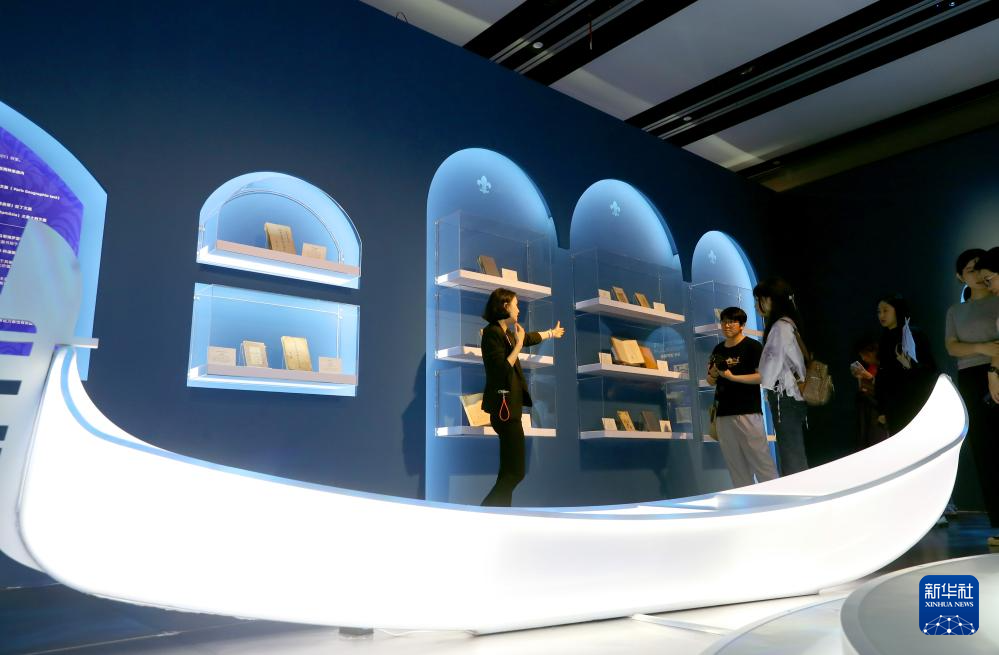 7月3日,工作人员(左)向参观者讲解一组马可·波罗相关文献资料的展品。