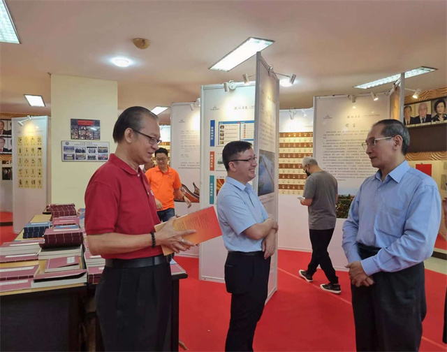 举办方负责人王斯诚(左二)陪同印尼福建社团联谊总会总主席俞雨龄(左三)等乡贤参观展览。陈英杰供图