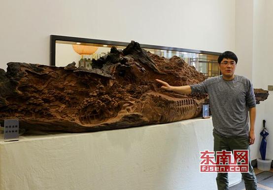 林建军创作的木雕作品《木兰溪》 东南网莆田4月9日讯(本网记者 王龙风 文/图)“木兰春涨与江能,日日江潮送晓风。”宋代兴化邑人龚茂良赋诗歌颂木兰陂的千秋功绩和建设们无私奉献的精神。“清清溪水木兰陂,千载流传颂美诗。公而忘私谁创始,至今人道是钱妃。”郭沫若1962年秋游览木兰陂后欣然以诗文抒情。古往今来,文人墨客赋诗文讴歌木兰陂的多有。有一位工艺美术大师,则以刀代笔,把木兰陂雕刻在国家级非遗项目——莆田木雕上,以此讴歌那可歌可泣的治水精神。近日,莆田市委宣传部组织省级驻莆媒体开展“木兰溪沿岸行”采风活动,探访这件工艺美术作品《木兰溪》。 这件《木兰溪》木雕工艺美术作品的作者名叫林建军。他是国家级非遗莆田木雕(省级)代表性传承人、福建省工艺美术大师、莆田市藏雲堂精微透雕艺术研究院院长。这件作品由金丝楠木雕刻而成,规格为425*65*90厘米。作品里,木兰陂是最主要的构成要素,溪水穿过木兰陂奔涌而下。在溪水沿岸,农家小院和田园牧歌意象相得益彰,将木兰溪孕育莆仙大地肥沃的土地以及孕育出璀璨的农耕文明,生动形象地展现出来。 “从古至今,一条河始终牵动着莆田人的心,那就是我们的母亲河木兰溪。我觉得我有责任拿起我手中的刻刀,用我的真情实感,把故乡的风土人情、历史风貌,用传承千年的莆田木雕技艺展现出来。”林建军说,他于1995年开始学艺,1999年超强台风引发的洪水带来的灾害让他记忆深刻、感受至深,而近些年来木兰溪得到系统治理、莆田城市发生翻天覆的变化,也让自己亲身感受到,因此想到了要围绕木兰溪主题创作作品。 “我从2015年就开始构思创作这件作品,前后耗时两年多时间才完成。”林建军说,为了不断寻找创作灵感,他先后数十次前往木兰陂实地查看、感受,而每去一次就会让他有更加深刻的领悟和认识,心上也就更多了一分故乡情怀和艺术家的责任。“近千年来,木兰陂影响了莆田的城市文明进程,影响了这座城市的发展历史,而这种坚韧不拔、前赴后继的治水精神和大爱无疆、造福百姓的家国情怀,值得我们这些后人不断弘扬学习。”