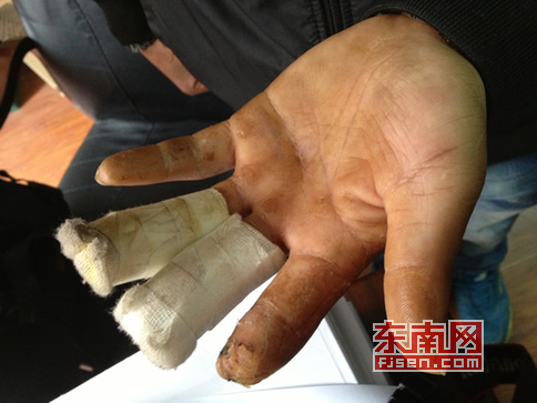外来工柏敏的左手食指、中指明显短了一截,无名指弯曲 东南网莆田1月10日讯(本网记者 陈艳艳 文/图)“去年12月,我在莆田正荣财富中心广场拔钢管时,不小心被滑轮绳索‘咬’断了两根手指,老板却只答应赔偿1万元……”前日,贵州外来工柏敏拨打本网新闻热线0594-2535366求助,称他现在想申请工伤鉴定,但由于工程经层层转包,工地负责人不配合提供材料,承包方也避而不见,令他至今投诉无门。 男子求助: 工伤致残两根手指只值一万? 去年11月,来自贵州的农民工柏敏在莆田正荣财富中心音乐喷泉广场打工。12月10日那天,不慎发生意外,“滑轮在吊钢管时,绳索突然松动,左手顺势卷入其中,食指和中指的第一节当场被夹断,鲜血不断往外冒……”一旁的工友发现后,立马打电话叫来工地负责人,将柏敏送往医院救治。 前日上午,记者看到柏敏的左手手指仍裹着纱布,食指和中指明显短了一截,呈畸形;左手无名指虽然保住了,但受伤后弯曲,至今无法伸直。据柏敏反映,出院后,工地相关负责人一直不愿与他商谈善后事宜。多次上门索赔,对方才最终答应,支付1万元作为赔偿。“理由是,他们已经垫付了9000多元医疗费……”这样的答复让柏敏难以接受,因此,他想申请工伤鉴定。 |