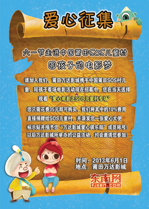 莆田万达影城发起爱心征集 东南网莆田5月30日讯 “这里是被人所遗忘的角落,那里有一群等待眷顾的天使,我们做的或许不够多,但我们在努力去让他们得到希望……”6月1日当天,莆田万达影城将“牵手”莆田sos儿童村,邀请60名儿童前往免费看电影。观影前,还将请他们至麦当劳吃大餐,并派发“六一”礼物。 |