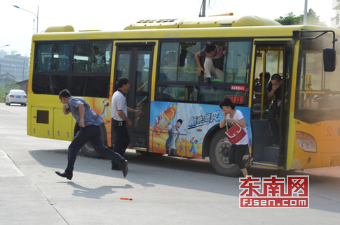 乘客逃生 东南网莆田7月2日讯(通讯员 陈斌 朱崇飞 文/图)6月27日下午,福建省莆田市荔城区政府组织宣传、交警、消防、安监、卫生等部门开展的交通事故大型综合应急演练。 下午16时整,演练正式开始。一部搭载20多名乘客的公交车行驶至荔城区宝胜路与延寿路交叉口,“嘭——”突然传来一声巨响,一辆违规行驶的渣土车从侧面撞上了公交车的后部,导致公交车起火,冒起浓烟,车上乘客不同程度受伤。 公交车司机迅速打开车门,让乘客逃生,但车后门因被撞变形无法打开。一些乘客从前门逃离,后面的乘客用救生锤砸碎车窗玻璃,跳窗逃生。与此同时,公交车和渣土车司机立即取下车上备用的灭火器,对准起火点进行扑救。但是火势蔓延很快,一下子就窜出2米多高,热浪逼人,普通灭火器根本就控制不了。而此时,有些乘客还被困在车上,情况十分危急。 |