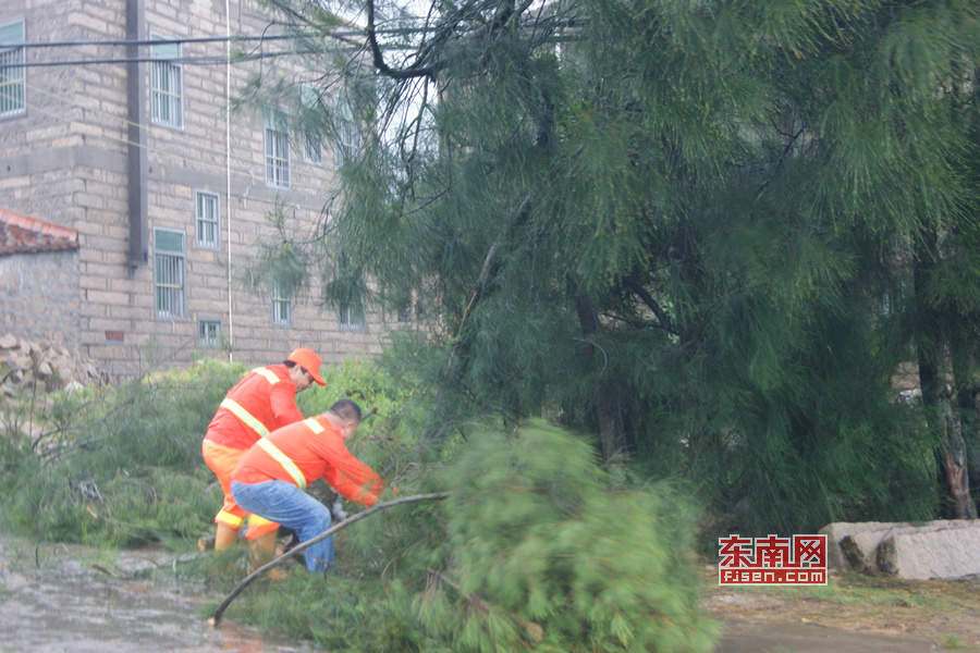 工作人员清理被台风吹断的树枝