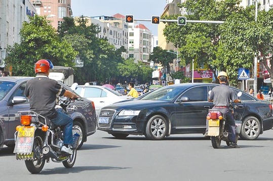 10月8日下午2点30分,胜利南街与文献路交叉路口,轿车等按指示灯行驶,但电动车、摩托车乱闯红灯使得交通拥堵异常。