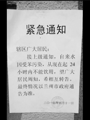 当地居民区贴出《紧急通知》。 今天中午将恢复供水 昨天下午,甘肃省政府新闻办通报称,兰州市威立雅水务集团公司出厂水及自流沟水样中苯含量严重超标,黄河水未受污染。通报称自来水苯超标的原因“据水厂分析可能是化工厂污染自流沟造成”。 资料显示,威立雅是兰州市城区唯一的供水企业。兰州市政府外宣办昨晚向早报记者表示,兰州威立雅水务集团公司是在11日的水质检测大分析时发现水苯含量超标。 黄河是兰州市区目前唯一的饮用水源。兰州市称,经多路水质检测,判定黄河水指标和自来水厂一厂至二厂南线输水管道水体指标正常,一厂至二厂北自流沟水体可能被污染。 这意味着污染并非发生于黄河取水口。早报记者了解到,检测出苯超标的自流沟连接于自来水一二厂中间,长约3公里,建于上世纪50年代,全程封闭且沿途没有排污口,但周边部分化工企业的一些管线与自流沟有交叉,且从自流沟下方穿过。 在昨天的新闻发布会上,兰州市长袁占亭称,根据初步调查,对威立雅公司自流沟污染源进行全面细致的排查,基本找准了污染点,马上切断了污染源。威立雅公司已向水厂沉淀池投加活性炭,吸附有机物,降解水体污染。未来24小时,市区内将降压供水,限制生产性用水。请广大市民不要饮用自来水。预计到12日中午,可以完全恢复正常供水。 袁占亭表示,针对自来水苯超标不能饮用的问题,已紧急组织有关方面,正在从周边地区调运桶装水和瓶装水,将通过各区政府和辖区街道、社区,向广大市民免费提供。高坪地区的用水,将通过城管、消防等部门,定时、定点提供。 兰州市政府官方网站昨晚通报称,经甘肃省环保厅环境监测站监测,截至昨日19时19分,威立雅水务集团自来水厂1号泵房取样点苯含量为20微克/升,2号泵房取样点苯含量为5微克/升;城关区张家园取样点,未检出苯物质含量;七里河区政府取样点,未检出苯物质含量;西固区福利区取样点,苯含量为20微克/升;安宁区培黎广场取样点,苯含量为18.85微克/升。