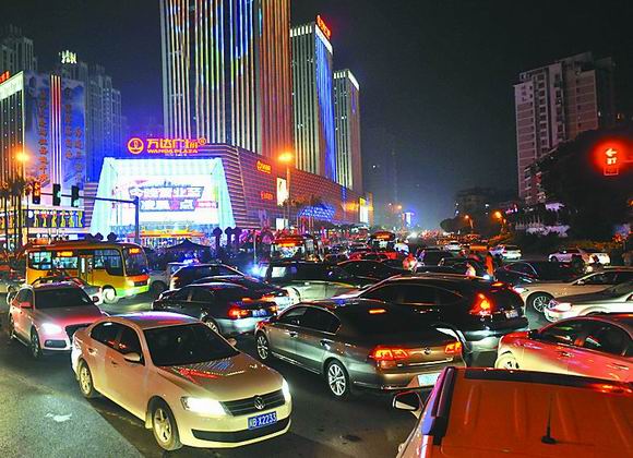 今年儿童节和端午节相连,节日出行人流量、车流量大。昨晚7时许,市区万达广场十字路口车辆拥堵,堵车超过1公里。(湄洲日报记者 蔡昊 摄) |
