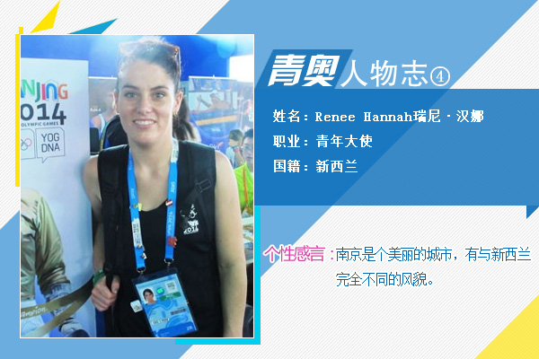 中国江苏网8月15日讯(记者 程远 王晶枫 刘浏)青年大使项目是南京青奥会的一项重要文化教育活动。国际奥委会选拔出了104名来自不同国家(地区)奥委会的优秀青年大使,目的为协助南京青奥组委更好地宣传和推广南京青奥会及其文化教育项目。 “我是唯一一名代表新西兰的青年大使。”在世界文化村的活动现场,记者碰见了这位戴着大墨镜、背着运动背包的姑娘。她叫Renee Hannah(瑞尼·汉娜),在新西兰为一家名为Sports New Zealand的政府机构工作。 “南京是个美丽的城市,与新西兰完全不同的风貌。”瑞尼告诉记者,在今年的3月份,就曾以青年大使的身份来到中国,参与了为期9天的青奥体验活动。“那时候游览了明城墙,品尝了中国美食,记忆犹新。”她说。青年大使们在体验活动中的职责就是亲身参与部分文化教育项目的测试、提出反馈意见,并将通过有趣的团队拓展活动认识其他青年大使。 “再次来到中国,主要是带领着团队内的年轻运动员们更好更快地适应在南京的生活。”瑞尼笑着说,会陪同他们参与各种活动安排。她告诉记者,南京青奥村建设得太美丽,这里还准备了如此多的文化交流活动,丰富了运动员们的业余时间,实在是太贴心了。“除了在青奥村,我这次还准备去其他场馆看看。” |
